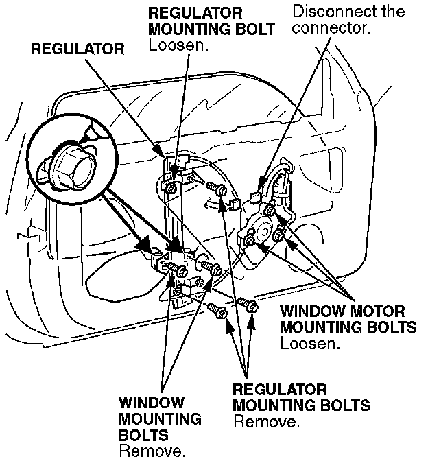 7. Loosen the upper left window regulator mounting bolt, and remove the other three bolts.