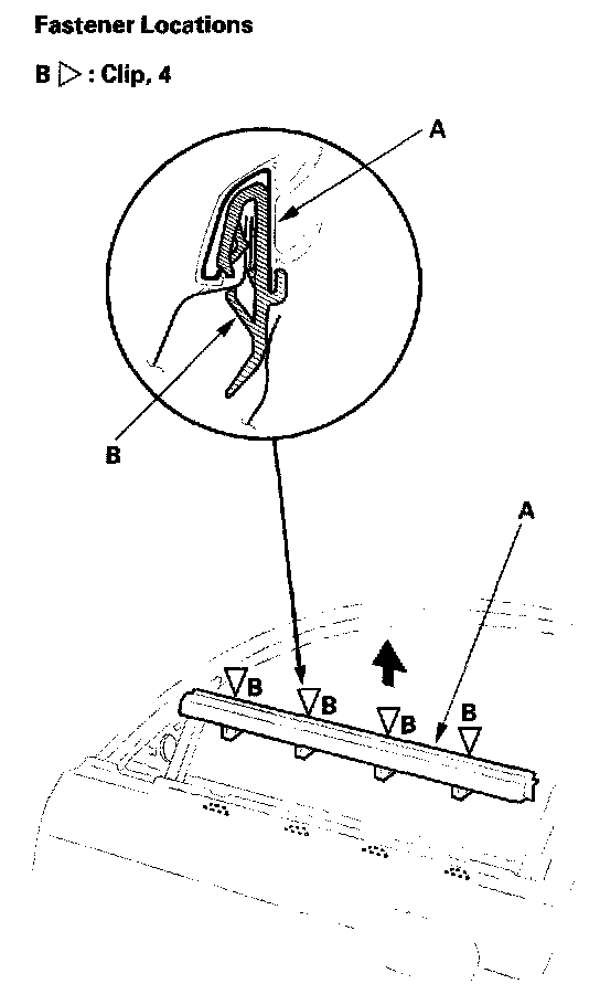 2. Starting at the rear, pry the door glass outer weatherstrip (A) up, and detach the clips (B)