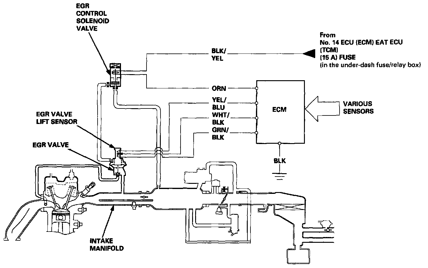 The ECM contains memories for ideal EGR valve lifts for varying operating conditions. The EGR valve lift sensor detects the amount of EGR valve lift and sends the information to the ECM. The ECM then compares it with the ideal EGR valve lift which is determined by signals sent from the other sensors. If there is any difference between the two, the ECM cuts current to the EGR control solenoid valve to reduce vacuum applied to the EGR valve.
