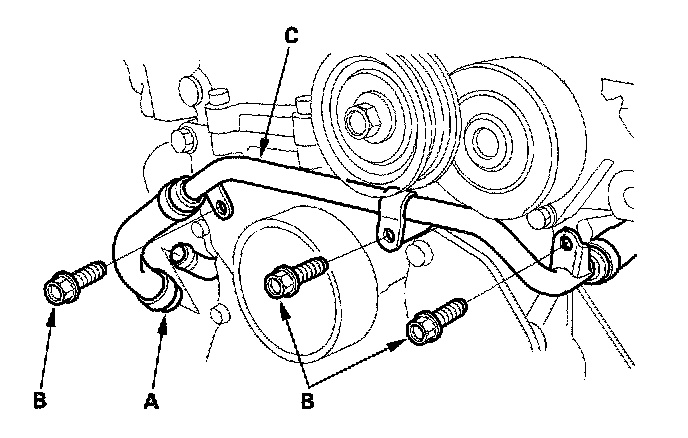 9. Remove the water bypass hose (A), then remove the three bolts (B) securing the water bypass tube (C).