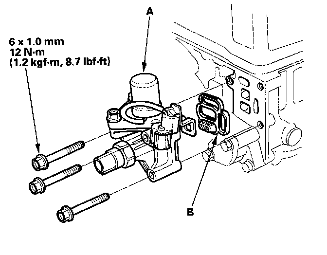 3. If the resistance is within specifications, remove the VTEC solenoid valve assembly (A) from the cylinder head, and check the VTEC solenoid valve filter (B) for clogging . If there is clogging, replace the engine oil filter and the engine oil.