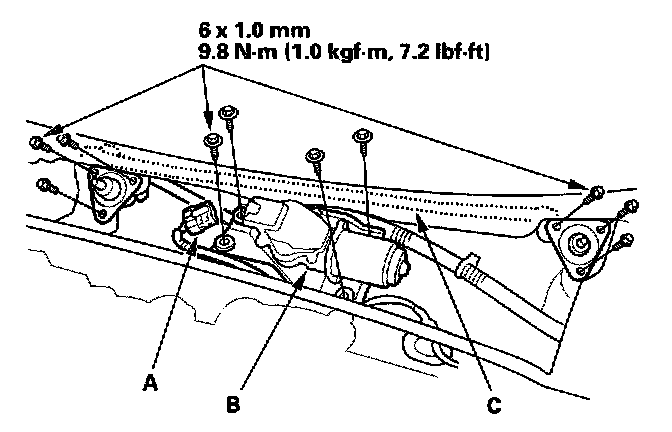 4. Remove the bolts, then remove windshield wiper linkage assembly (C).