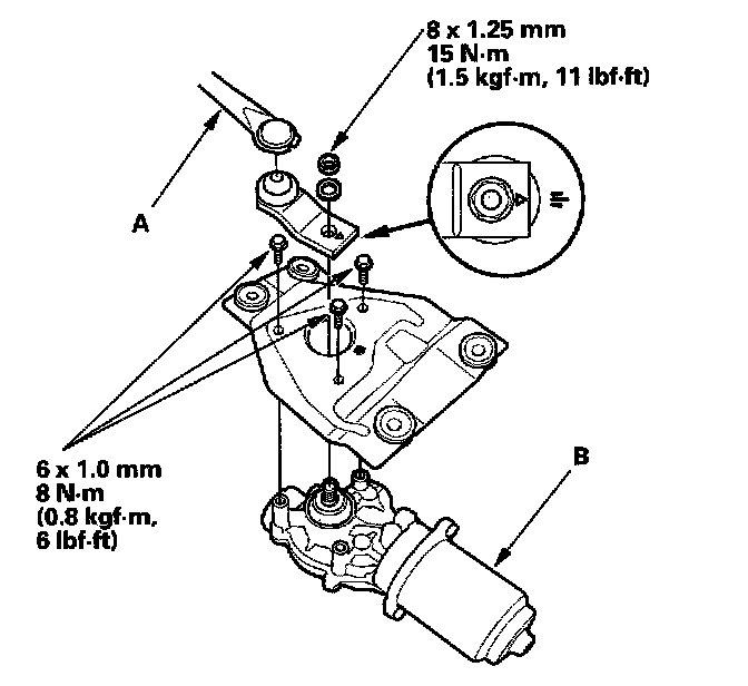 5. Remove the three mounting bolts and nut from the wiper linkage (A) to remove the wiper motor (B).