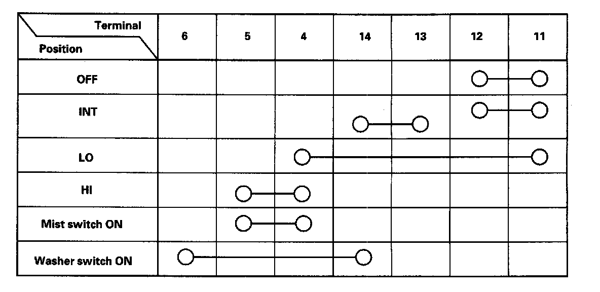 4. Check for continuity between the terminals in each switch position according to the table. If the continuity is not as specified, replace the switch.