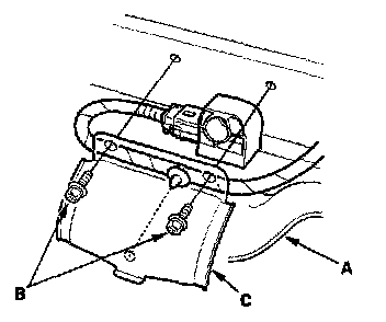 6. Turn up the carpet (A), then remove the two mounting bolts (B) and the plate (C).