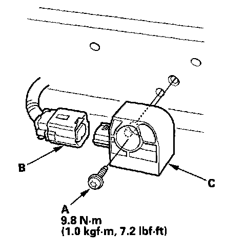 1. Install the new side impact sensor with a new Torx bolt (A), then connect the side wire harness 2P connector (B) to the side impact sensor (C).