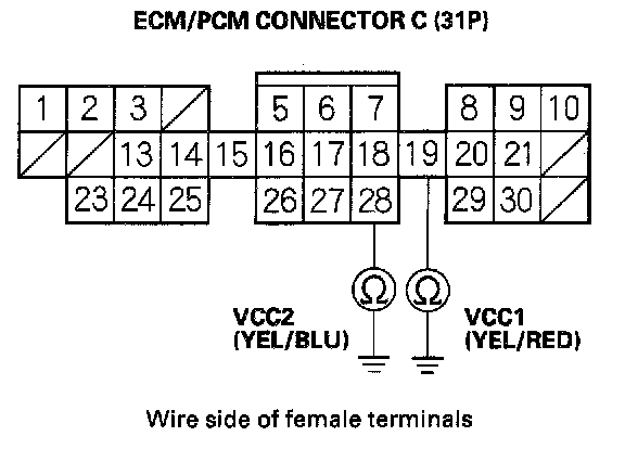 10. Turn the ignition switch OFF, then disconnect ECM/PCM connector C (31P), and check for continuity between body ground and ECM/PCM connector terminals C19 and C28 individually.