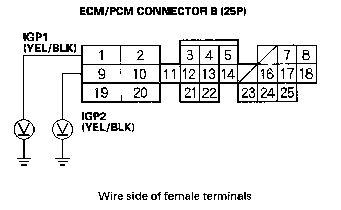 13. Turn the ignition switch ON (II), and measure voltage between body ground and ECM/PCM connector terminals B1 and B9 individually.