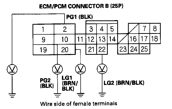 15. Turn the ignition switch ON (II), and measure voltage between body ground and ECM/PCM connector terminals B2, B10, B20, and B22 individually.