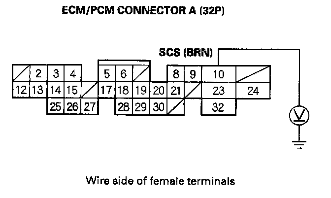 16. Turn the ignition switch OFF, then turn it back ON (II), and measure voltage between ECM/PCM connector terminal A10 and body ground.