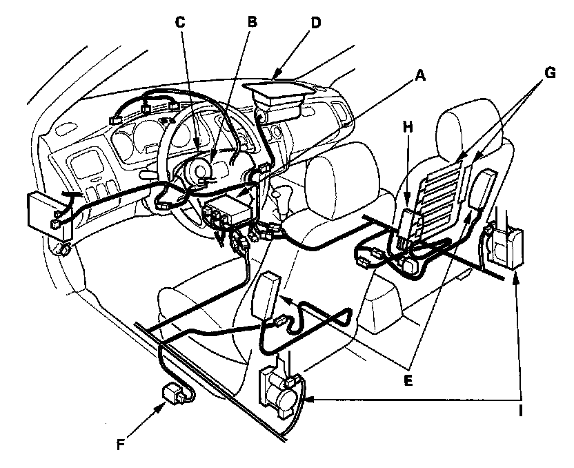 The SRS is a safety device which, when used with the seat belt, is designed to help protect the driver and front passenger in a frontal impact exceeding a certain set limit. The system consists of the SRS unit, including safing sensor and impact sensor (A), the cable reel (B), the driver's airbag (C), the front passenger's airbag (D), side airbags (E), and seat belt tensioners (I).