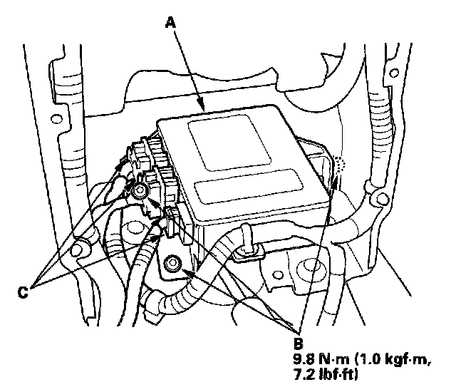 1. Install the new SRS unit (A) with Torx bolts (B), then connect the connectors (C) to the SRS unit; push it into position until it clicks.