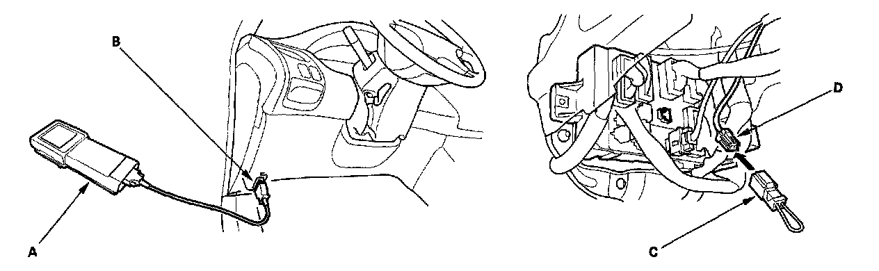 4. Connect the Honda PGM Tester (A) to the DLC (16P) (B), and follow the Tester's prompts in the "SCS" menu (see the Honda PGM Tester Operator's Manual).