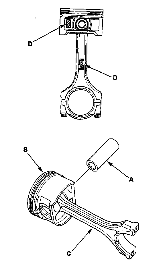 4. Install the piston pin (A). Assemble the piston (B) and connecting rod (C} with the embossed marks (D) on the same side.