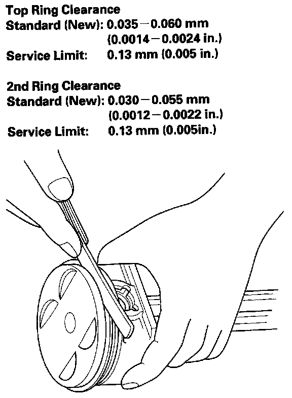 7. After installing a new set of rings, measure the ring-to-groove clearance: