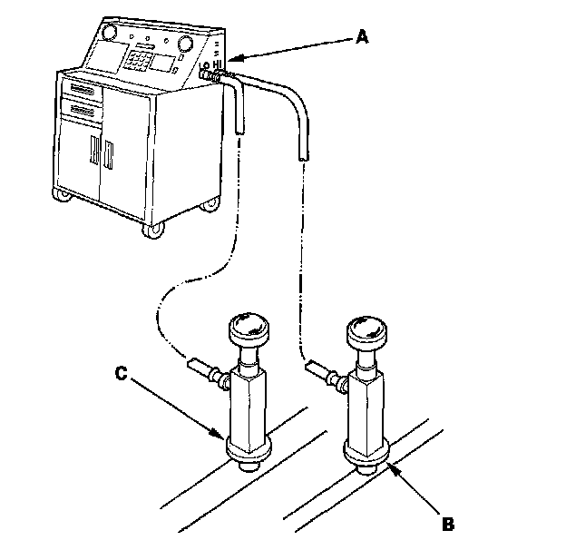 1. Connect a R-134a refrigerant recovery/recycling/charging station (A) to the high-pressure service port (B) and the low-pressure service port (C), as shown, following the equipment manufacturer's instructions.