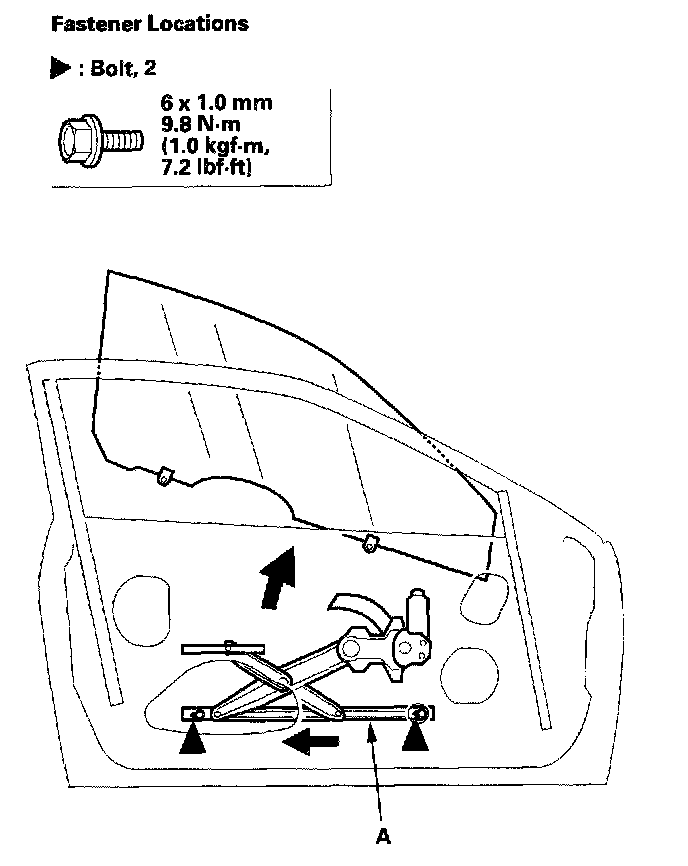 2. Carefully lower the glass until you can see the bolts, then loosen them. Slide the guide (A) to the rear, then remove the glass from the guide, and lift it out through the window slot. Take care not to drop the glass inside the door.