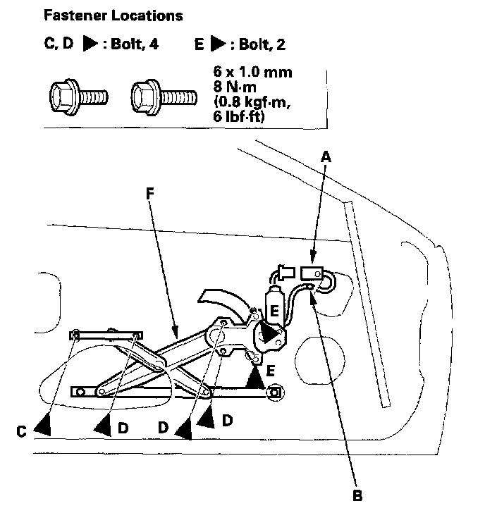 3. Disconnect and detach the connector (A) and harness clip (B) from the door. Scribe a line around the rear roller guide bolt (C) to show the original adjustment. Remove the bolts (C, D) and loosen the bolts (E), then remove the regulator (F) through the hole in the door.