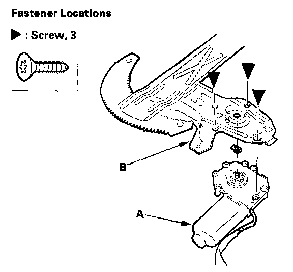 5. Using a Torx T20 bit, remove the screws, then separate the power window motor and regulator (B).