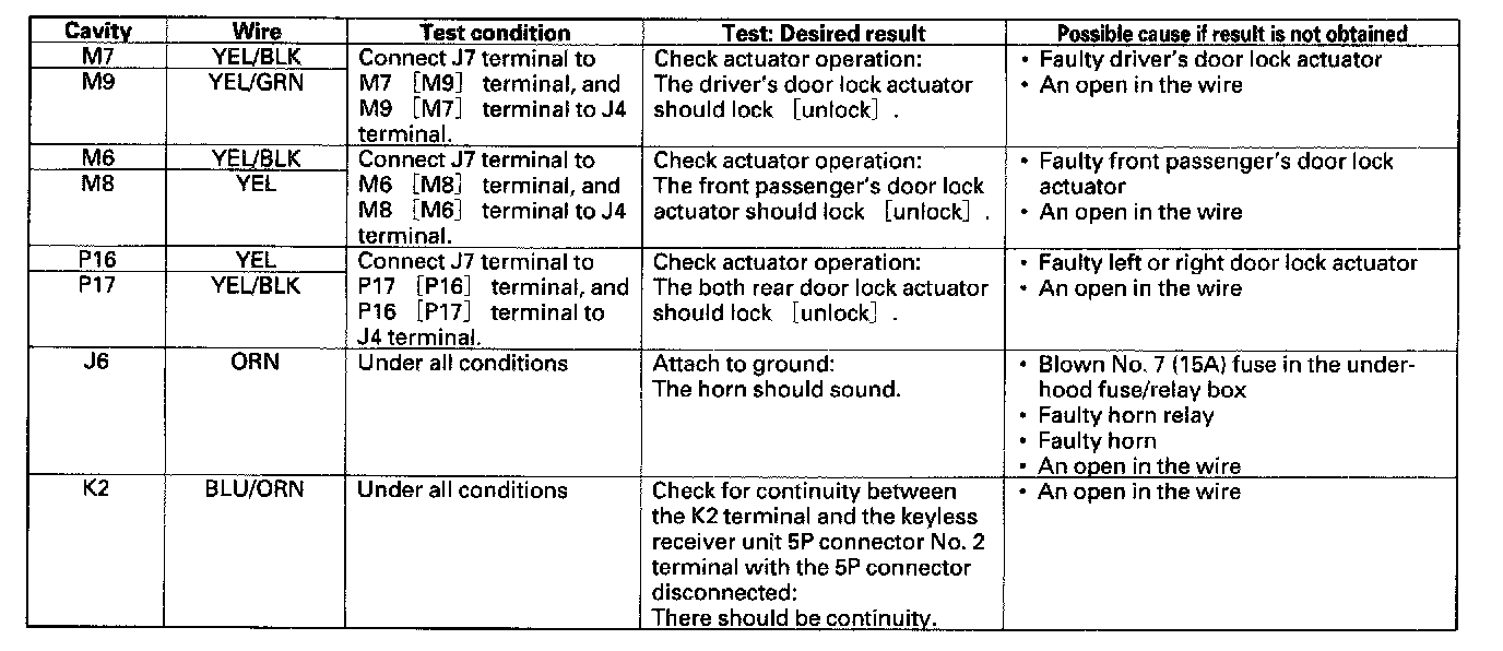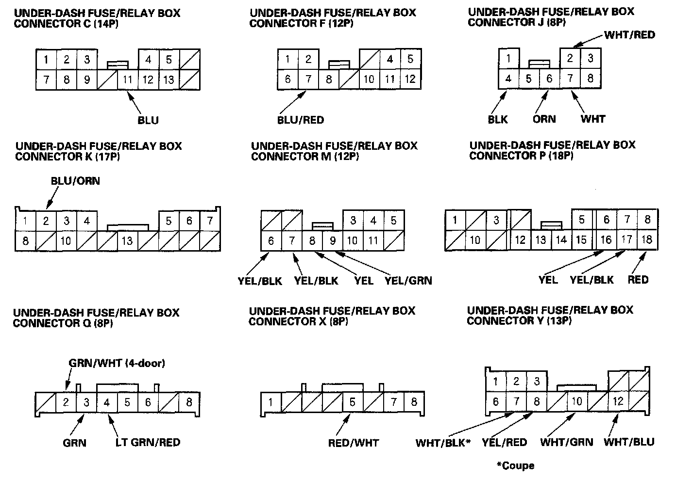 6. Disconnect the M, P, K, and J connectors from the under-dash fuse/relay box, and make these input tests at the connectors.