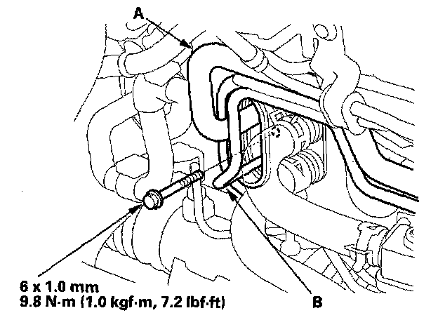 2. Remove the bolt, then disconnect the suction line (A) and the receiver line (B) from the evaporator core.