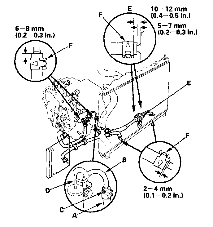 2. Connect the cooler hoses to the line, ATF filter (E), and ATF cooler, and secure them with the clips (F) as shown.