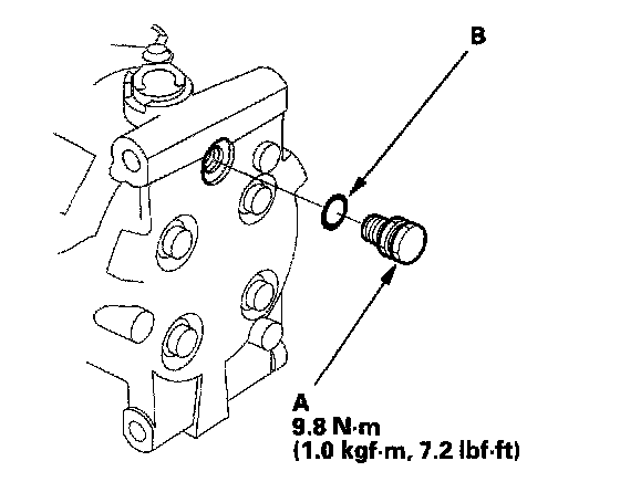 2. Remove the relief valve (A) and the O-ring (B). Plug the opening to keep foreign matter from entering the system and the compressor oil from running out.