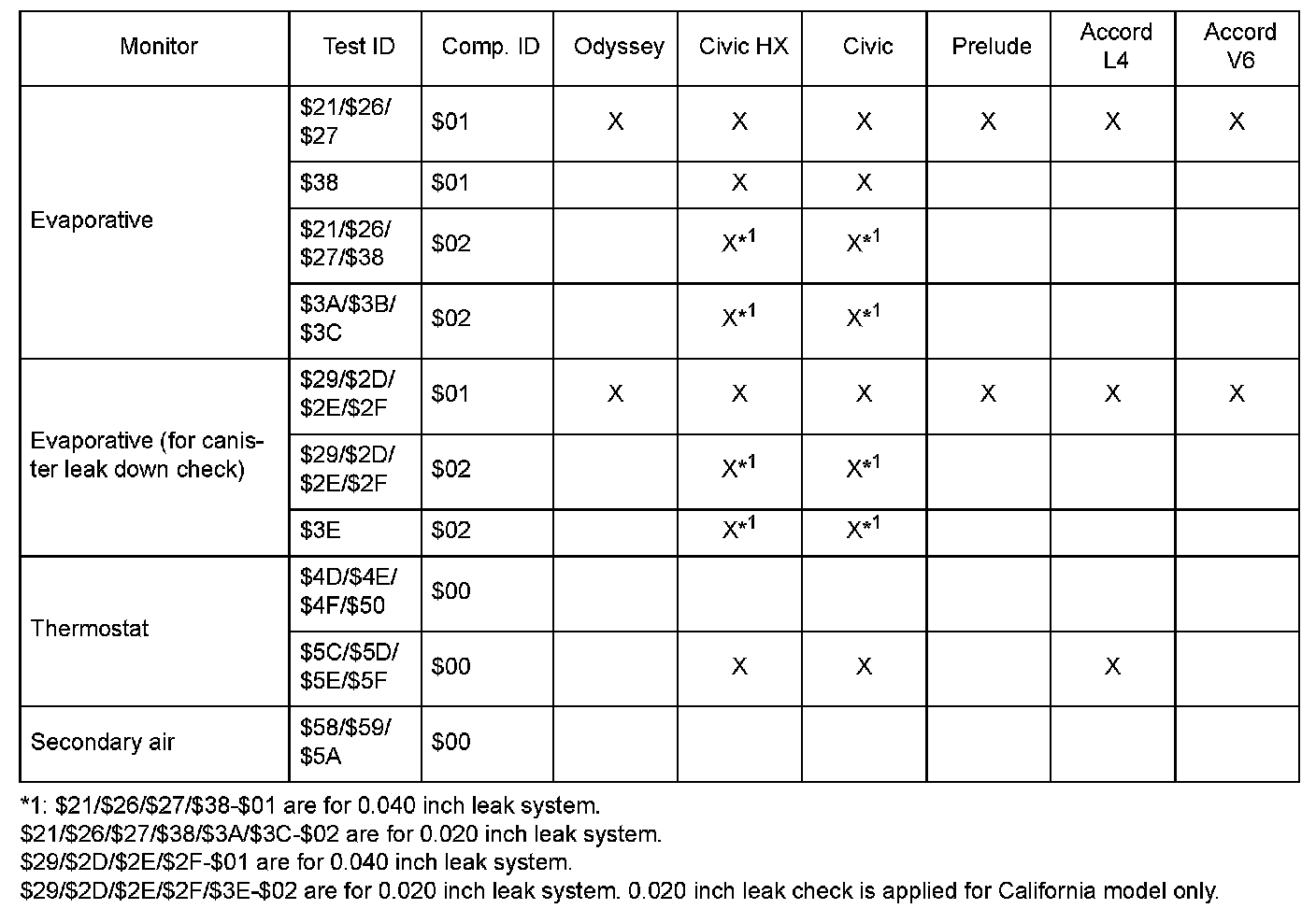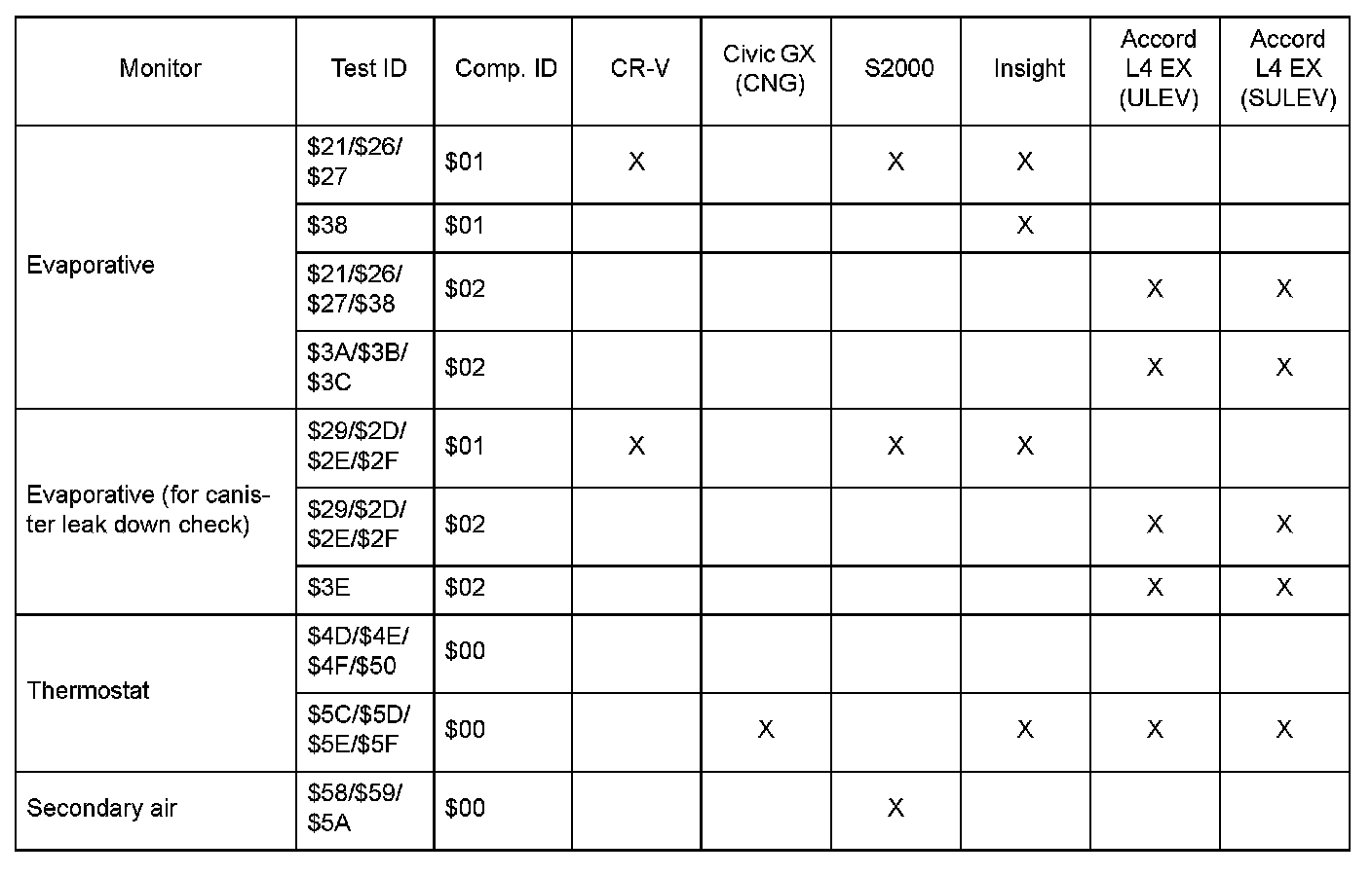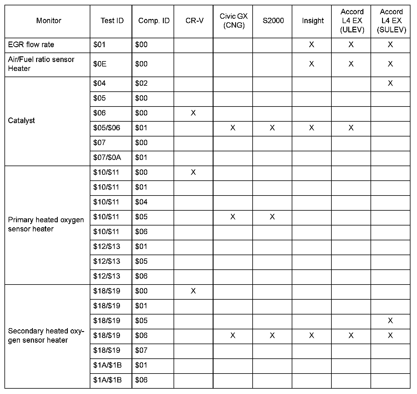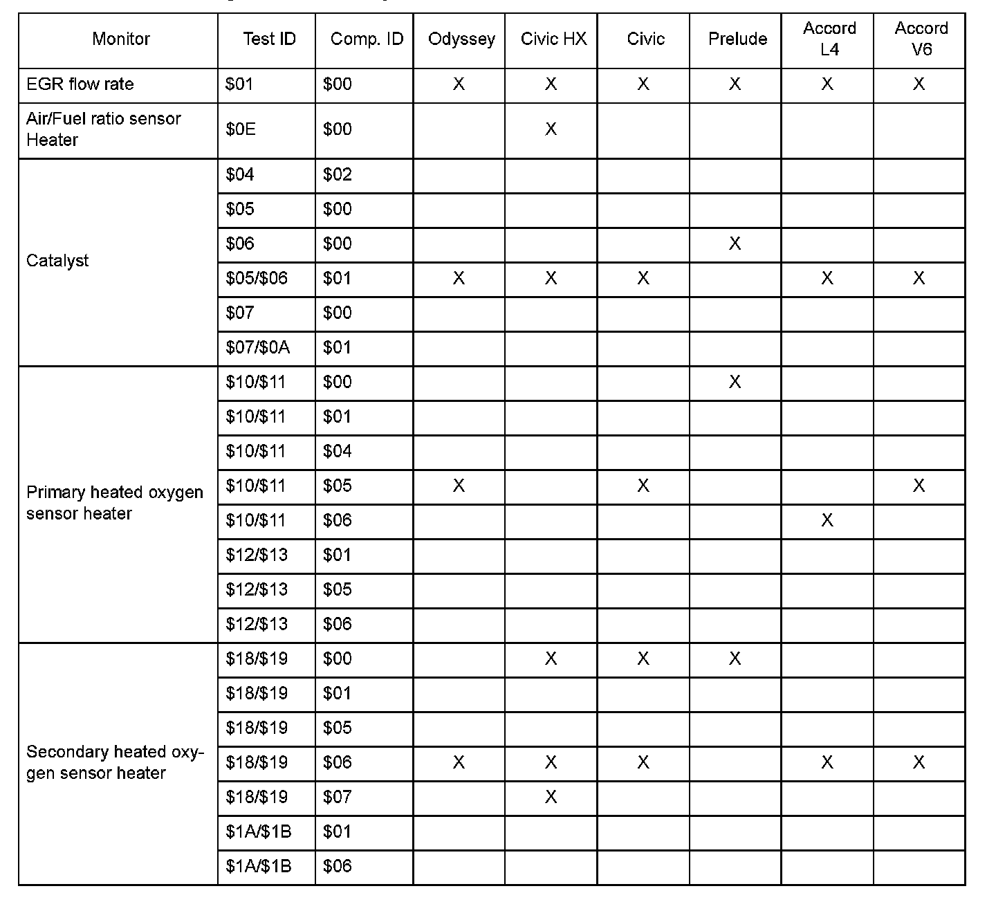 SAE J1979 Mode $06 Test Information: All 2001 Hondas
