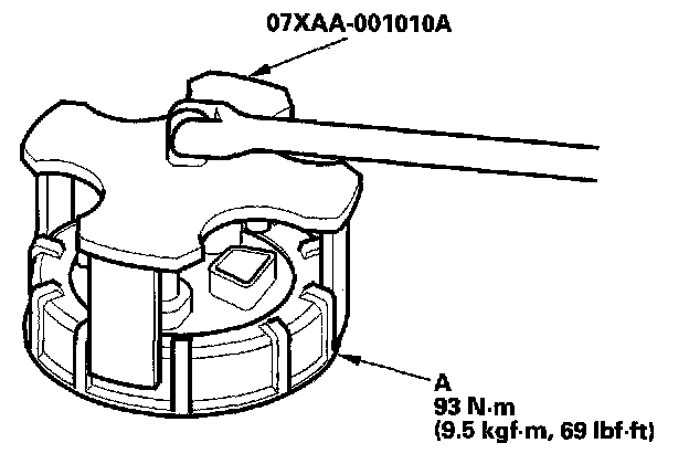 3. Using the tool, loosen the fuel tank unit locknut (A).