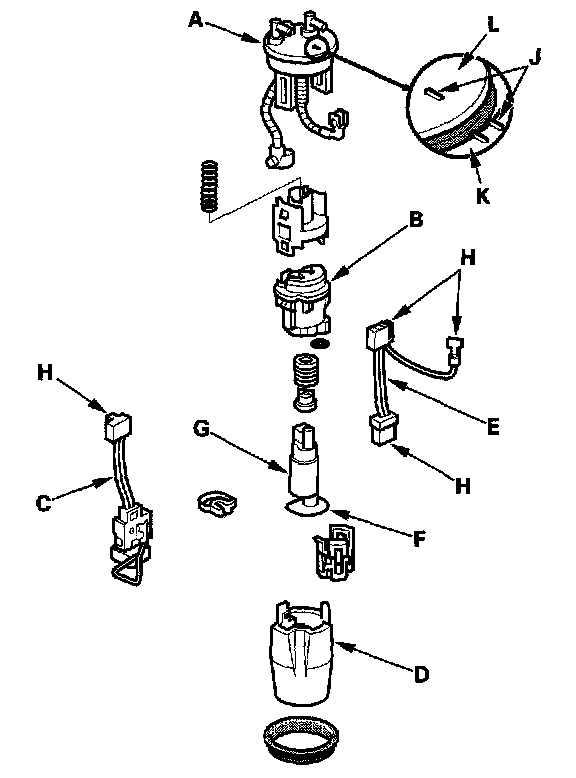 - When installing the fuel pump assembly, align the marks (J) on the fuel tank (K) and the fuel pump assembly (L).