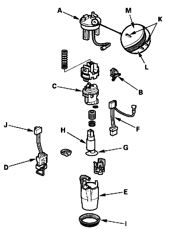 - When installing the fuel pump assembly, align the marks (K) on the fuel tank (L) and the fuel pump assembly (M).