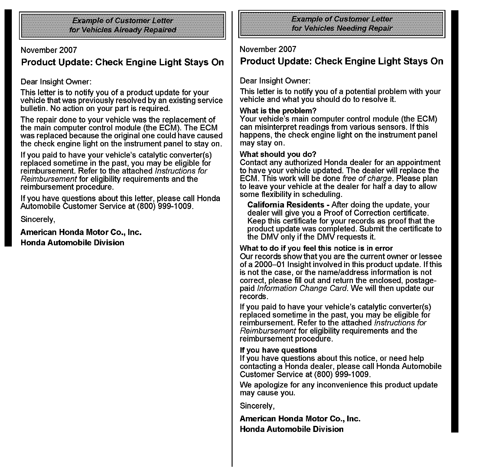 Examples of Owner Letters for Vehicles Already Repaired/Needing Repair