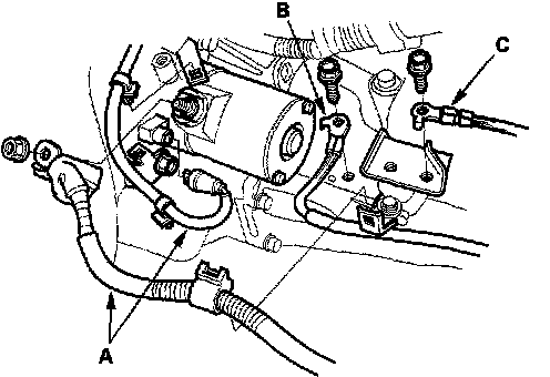 6. Disconnect the starter motor cables (A), transmission ground cable (B), and engine ground cable (C).