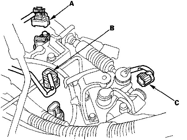 7. Disconnect the vehicle speed sensor (VSS) (A), back-up light switch (B), and neutral switch (C) connectors.