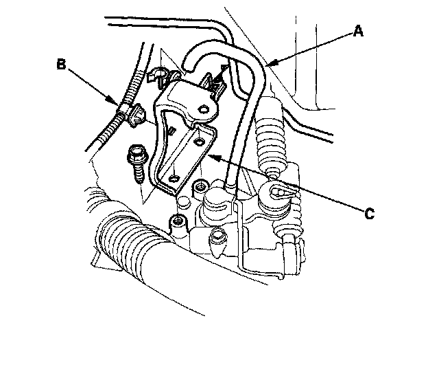 8. Remove breather tube (A) and harness clip (B), then remove the air cleaner bracket (C).