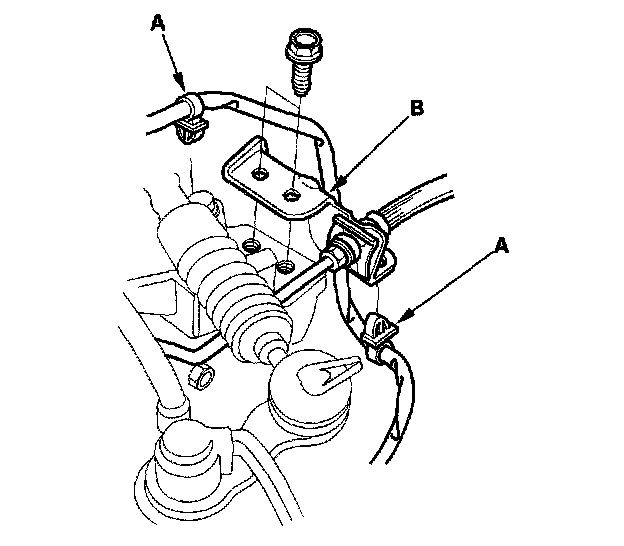9. Remove the wire harness clamps (A) and clutch line bracket (B).