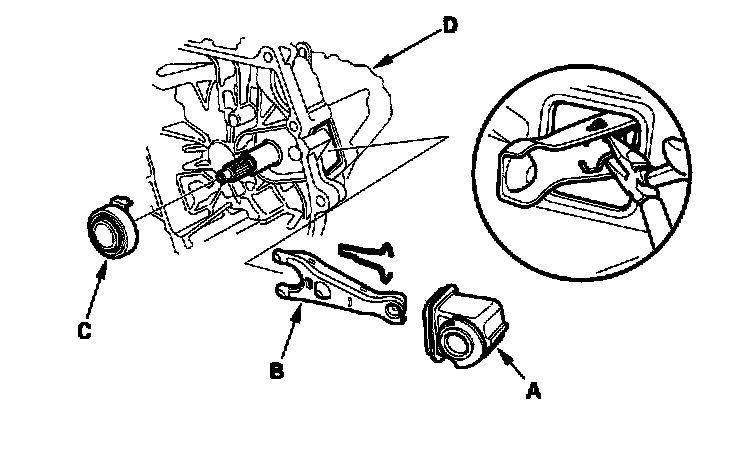 22. Remove the boot (A), the release fork (B), and the release bearing (C) from the transmission (D).