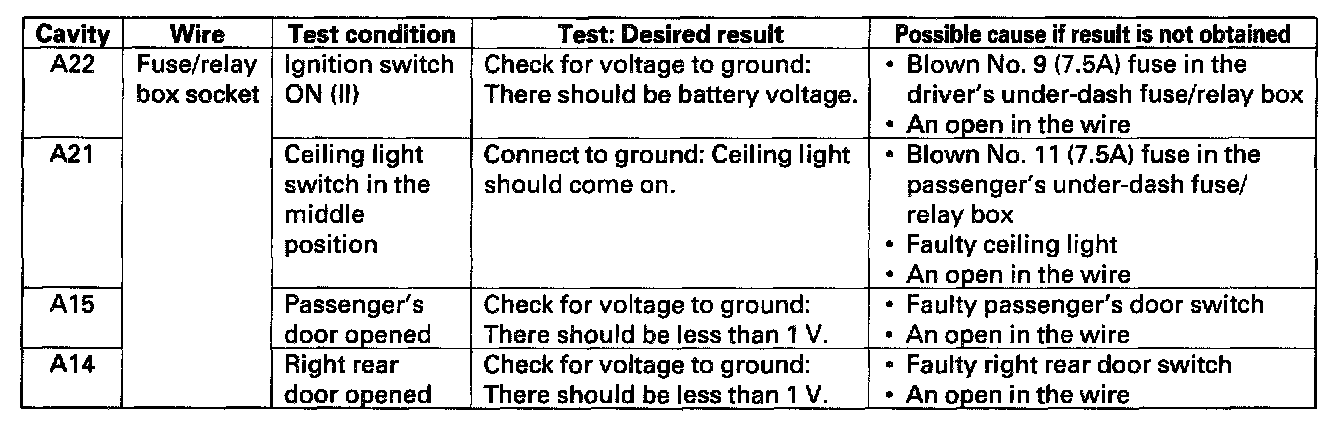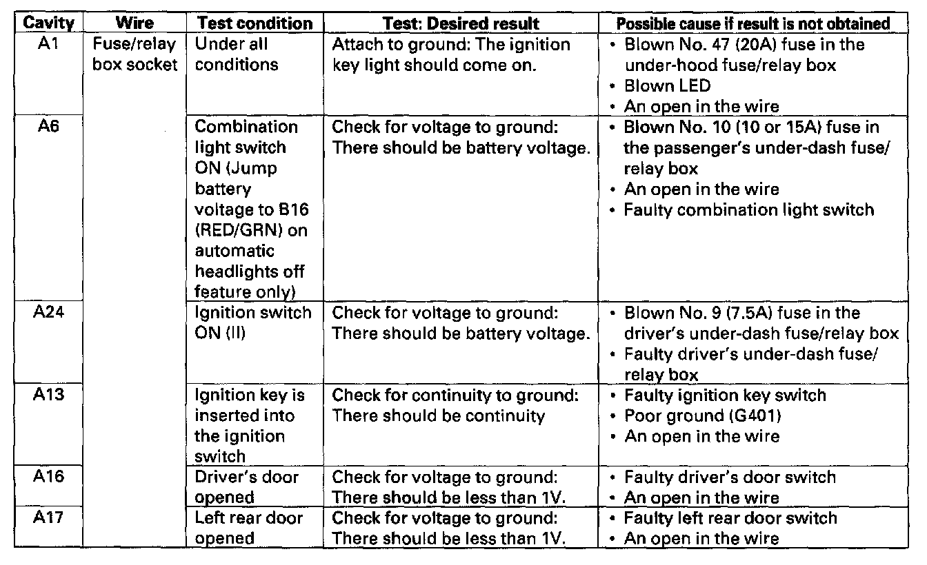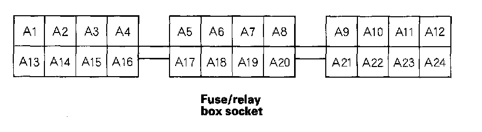 4. With the driver's unit still disconnected, make these input tests at the fuse/relay box socket.