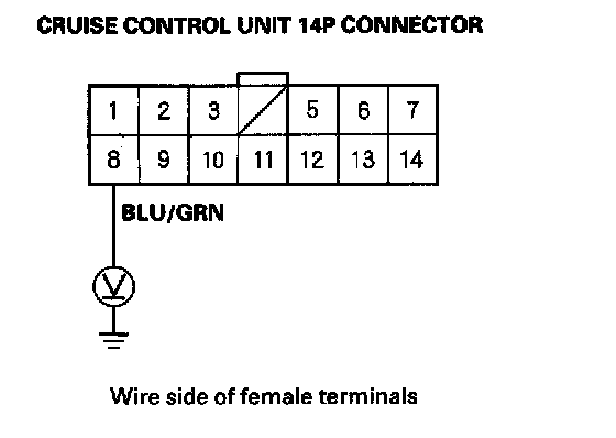 8. Connect a voltmeter between cruise control unit 14P connector terminal No.8 and body ground. Test-drive the vehicle at speeds over 25 mph (40 km/h) with the cruise control set, and watch the voltmeter.