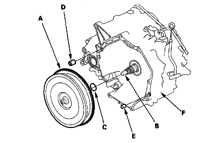 4. Install the 14 mm dowel pin (D) and 10 mm dowel pin (E) in the torque converter housing (F).