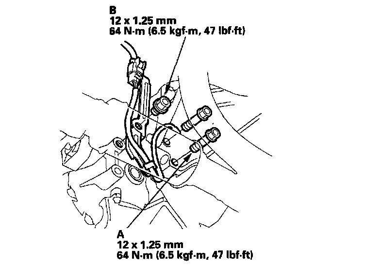 6. Attach the transmission to the engine, then install the transmission housing mounting bolts (A) and connector bracket bolt (B).