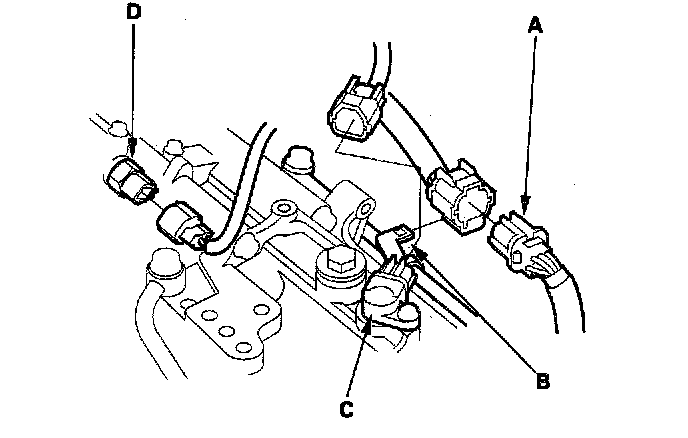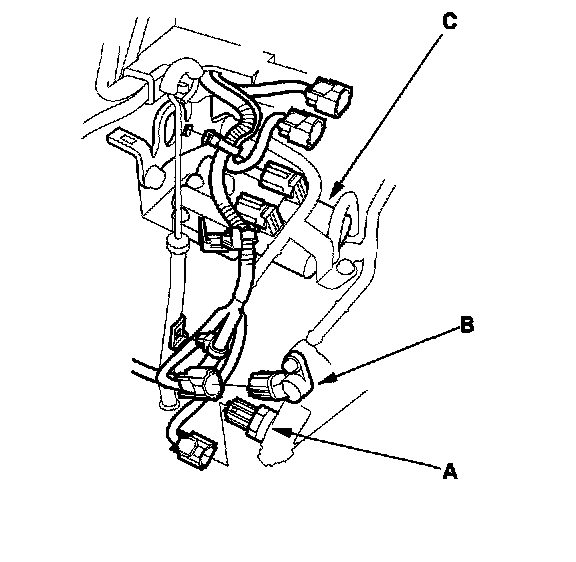 33. Connect the connectors to the 3rd clutch pressure switch (A), mainshaft speed sensor (B), and A/T clutch pressure control solenoid valves A and B (C), then install the clamps on the clamp brackets. Do not allow water, fluid, oil, dust, or other foreign particles to enter the 3rd clutch pressure switch connector.