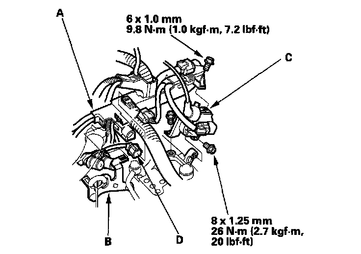 31. Install the harness cover (A) on the transmission hanger (B), then install the ignition coil (C). ('98-99 models)