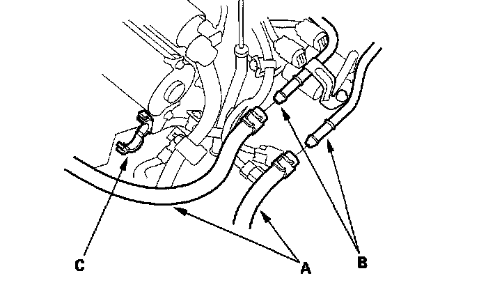 37. Connect the ATF cooler hoses (A) to the ATF cooler lines (B). Clamp the ATF cooler hose with the clamp (C) on the starter.