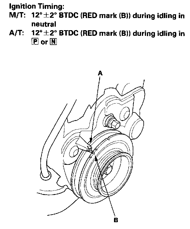 4. Connect the timing light to the No.1 ignition wire, then point the light toward the pointers (A) on the timing belt cover. Check the ignition timing in no load conditions: headlights, blower fan, rear window defogger, and air conditioner are not operating.