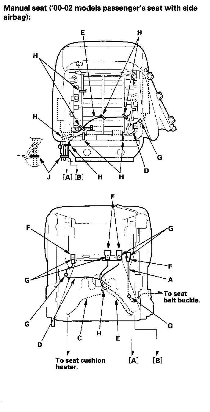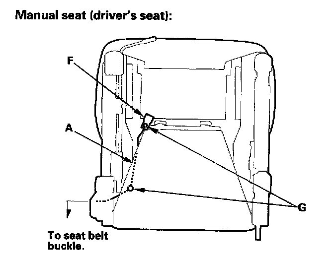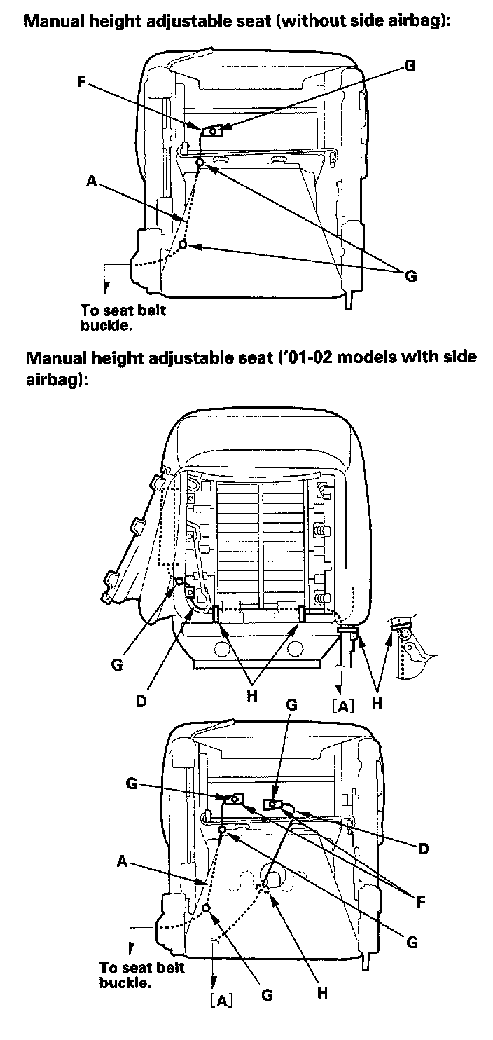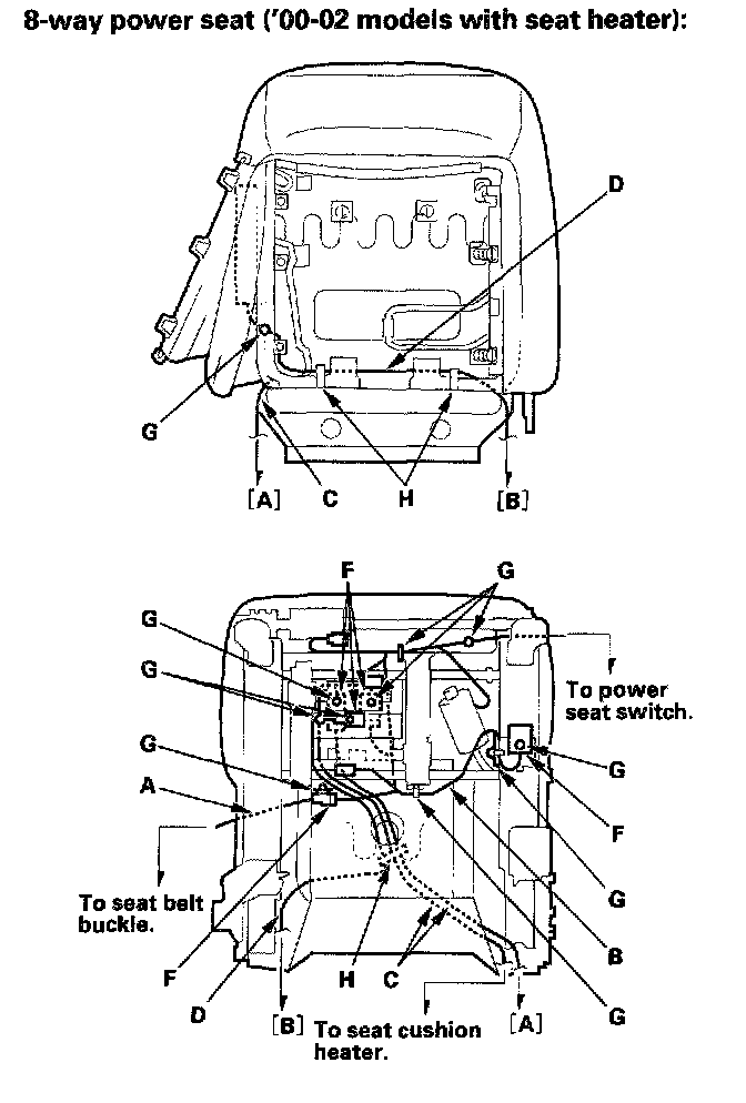 Front Seat Wiring Harness InstallationWhen assembling the front seat, make sure the seat belt switch harness (A), seat harness (B), seat heater harnesses (C), side airbag harness (D), OPDS unit harness (E), connectors (F), clips (G) and wire ties (H) are fastened correctly.