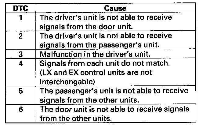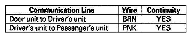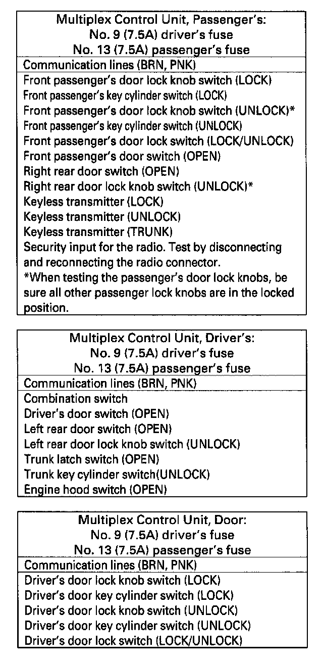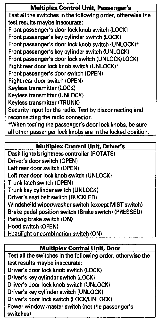 15. Look in the following tables for the switch most closely related to the problem. Test all the switches in the following order, otherwise the test results maybe inaccurate. While still in Mode 2, operate that switch to test the wire, switch, and its control unit input. If the circuit is OK, the ignition key light should blink once and the beeper should beep once. If the circuit is faulty, there will be no indication.