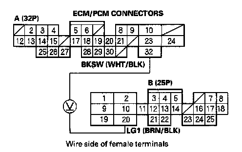 3. Measure voltage between ECM/PCM connector terminals A32 and B20 with the brake pedal pressed.