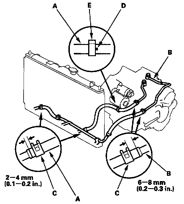 Connect the cooler hoses (A) to the lines (B) and the ATF cooler, and secure them with the clips (C).