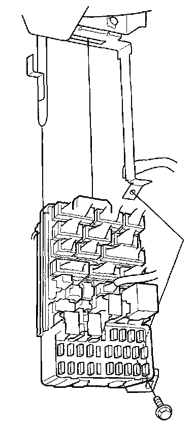 5. Remove the mounting bolt and slide the under-dash fuse/relay box (A) down from the bracket (B).
